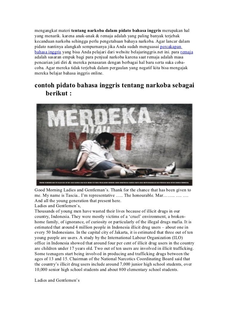 Text 1 Assalamualakum Wr Wb Best wishes. Contoh Pidato Bahasa Inggris tentang Narkoba dan artinya 11 July 2013 12 November 2010 by Imam Khanafi Pidato bahasa inggris tentang narkoba sangat diperlukan untuk para siswa karena anak-anak remaja adalah yang paling banyak terjebak kecanduan narkoba. Contoh pidato ini bisa dipakai oleh anak sekolah baik anak SD SMP SMA kuliah bahkan untuk pekerja sekalipun.